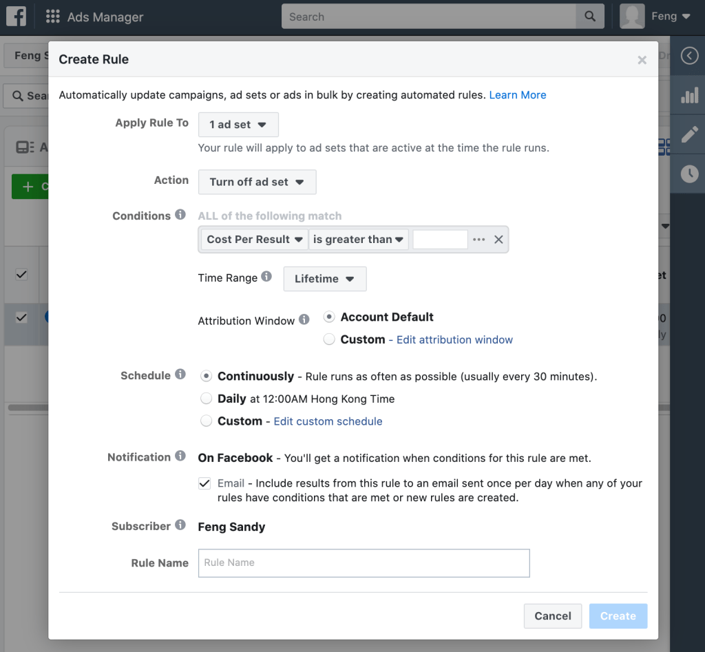如果你从来没有创建Automated Rules,那么创建的时候它们会自动获取账号下的所有广告,并在任何广告更新时给到提醒。每条规则需要设置三样东西:
