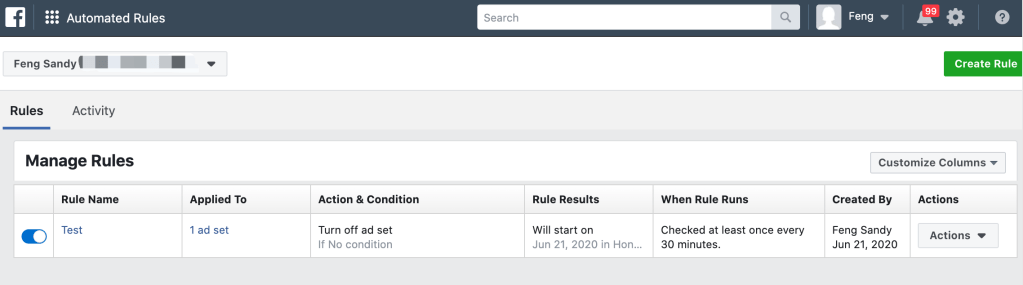 在Ads Manager里,选需要应用Rule的 campaign/ad set/ads,创建一条Rule