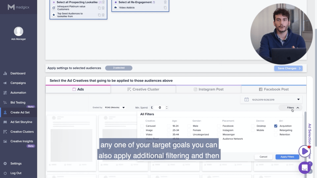 受众Ready了,接下来给广告选Creative。这边可以筛选受众和指标,于是Madgicx自动计算出表现最好的广告素材,直接应用,广告建完。