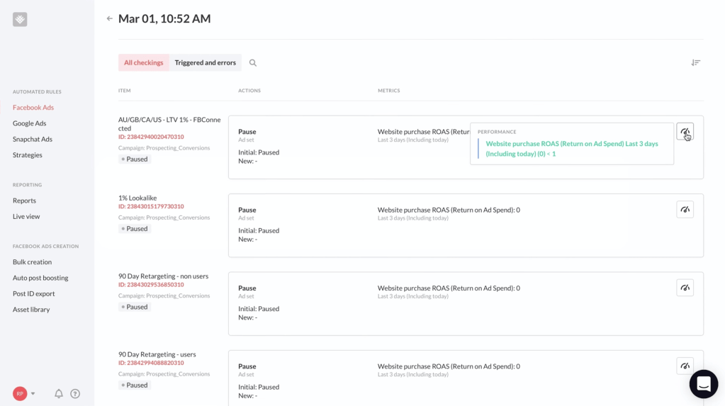 最后,每一次自动的广告调整,能够在Logs里看到。某条广告被做了什么调整,为什么、触发了哪条规则。因为Revealbot更偏向于一款人主导和设计投放规则的的效率工具,这些Log方便投手回顾Ads的表现、规则是否合理,是挺有用的一块功能。