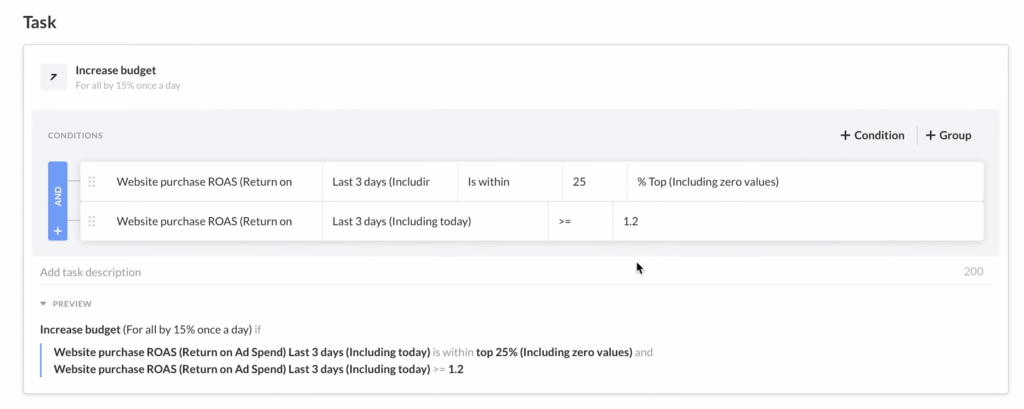 Revealbot也提供了一些预置的调整策略,比如基于提供给电商客户,基于ROAS的一组三种调整配置。另外,也提供了比Ads Rules更进阶的指标条件,比如ROAS达到Top 1/4且高于1.2,提高预算(Ads Rules一条规则只能设一个条件)。