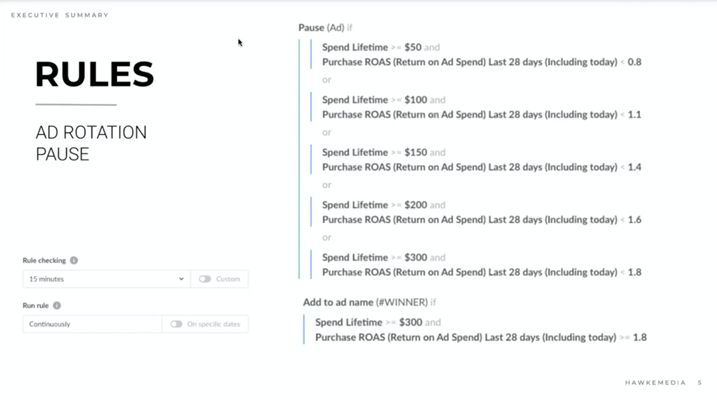 策略一:滚动暂停广告。根据总花费要求ROAS,否则关停;对总花费超过$300且ROAS 超过1.8的广告加上“#WINNER”标题