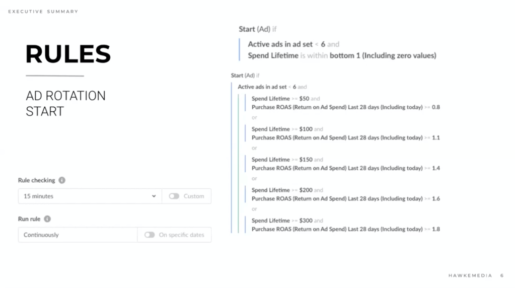 策略二:滚动重启广告。在保证每个Ad Set不超过6个Ad的情况下(因为这样FB才不会给某条广告分过少的预算),复活ROAS达到要求的广告