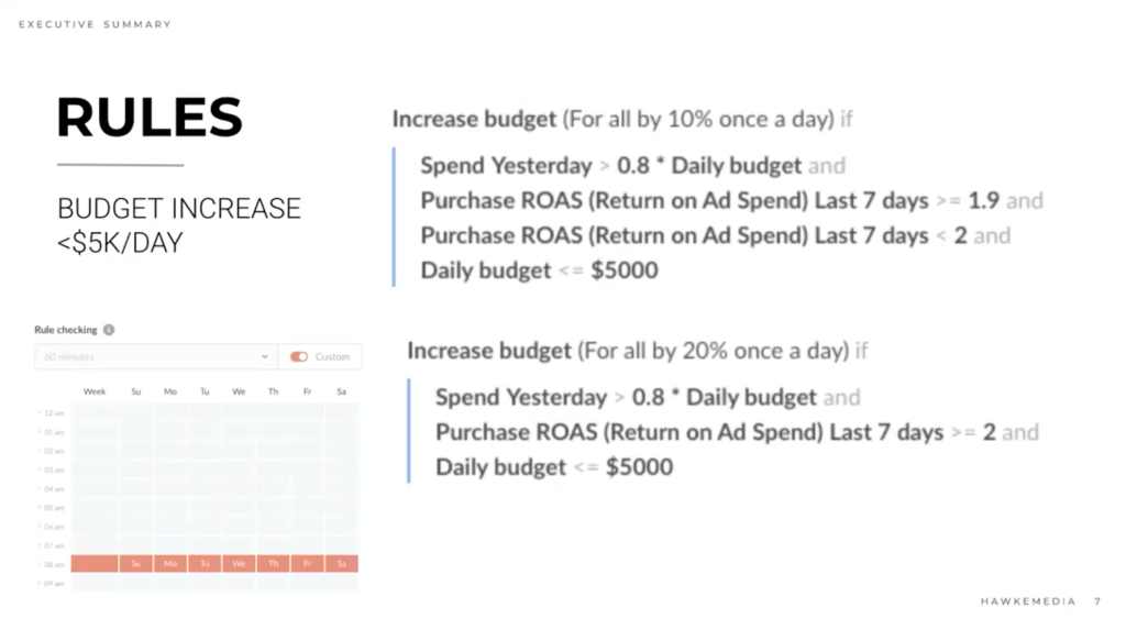 策略四:对于预算超过$5K/天的广告,根据近七天ROAS表现,调高5%/10%预算。
