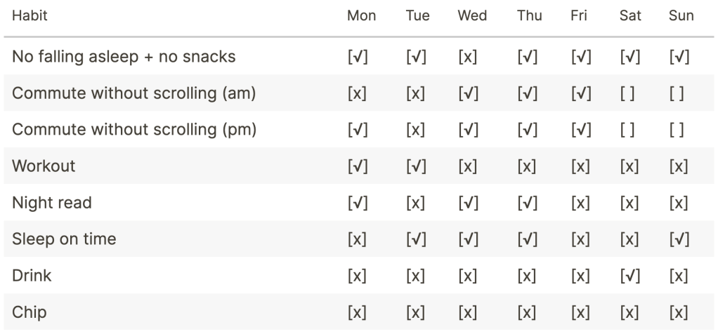 I listed out all the habits I could think of on notebook. I’m surprised about suffering from bad ones on a daily basis but I have no motivation to address them. I’m glad that I take the first step and then realize some of them are quite easy to fix. As an example, every morning after washing face I’ll put on the elusion, wait for them to be absorbed and then put on sunscreen. Therefore I usually forget to come back. I plan to solve it by washing face before brushing teeth, leaving sometime for my skin to get dry.